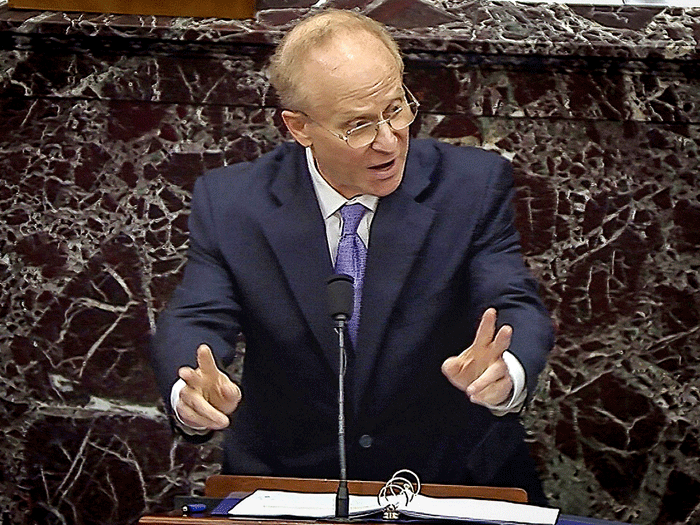 Facing off against the impeachment managers at every step along the way were three lawyers: Bruce Castor, David Schoen and Michael van der Veen. Castor and van der Veen are both partners in the same Philadelphia law firm, while David Schoen is a solo practitioner from Atlanta. He is also an Orthodox Jew. That fact came up a couple of times during the trial, first in connection with his request at the outset to adjourn the trial over Shabbos (a request that was granted but which he later withdrew), and then because he covered his head while taking a drink of water while speaking to the Senate.
